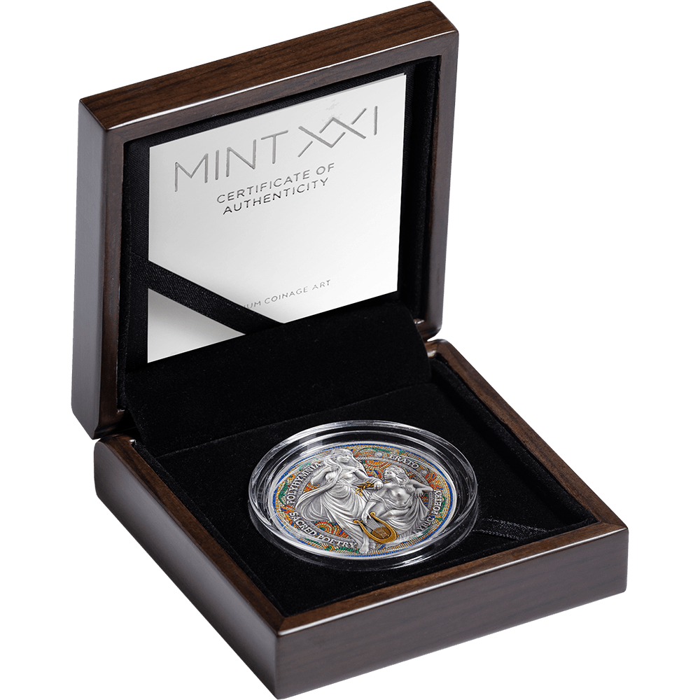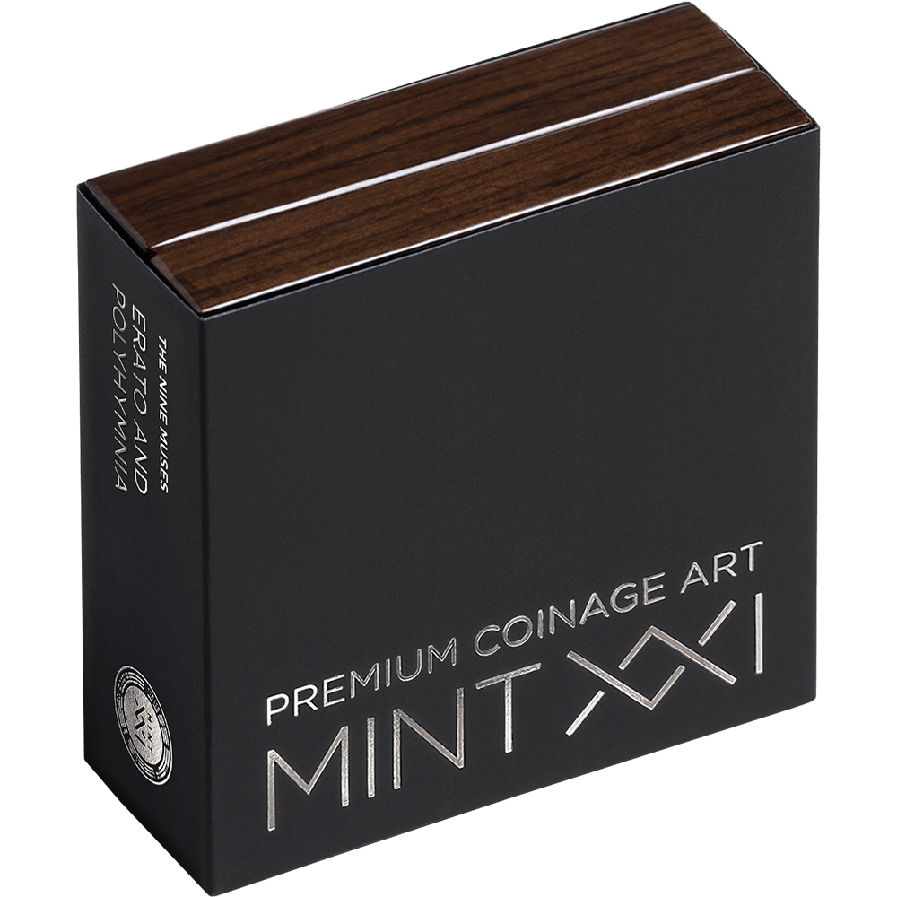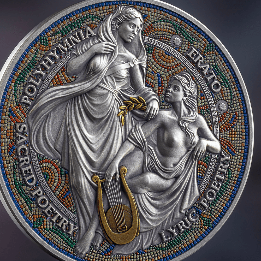 This 2 oz silver coin renders both muses in expressive high relief, capturing the elegance of their forms and the contrast of their poetic realms. Digital printing recreates the signature ancient mosaic effect, while digital gilding adds luminous accents to the composition — enriching the scene with classical grandeur and radiant depth. The final issue of The Nine Muses collection, this coin brings the series to its poetic completion. A crowning piece for collectors fortunate enough to unite all the voices of the Nine Muses — Calliope, Clio, Euterpe, Thalia, Melpomene, Terpsichore, Erato, Polyhymnia, and Urania — masterfully brought to life by MINT XXI.