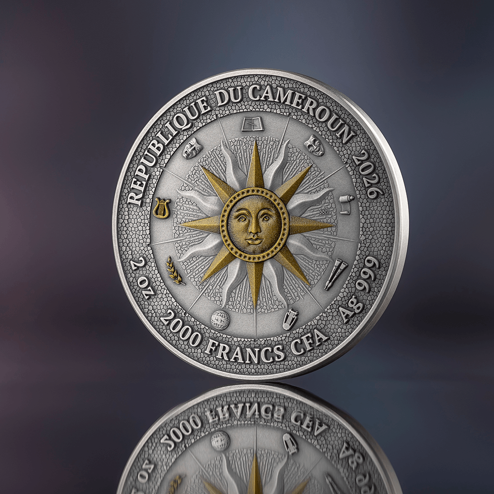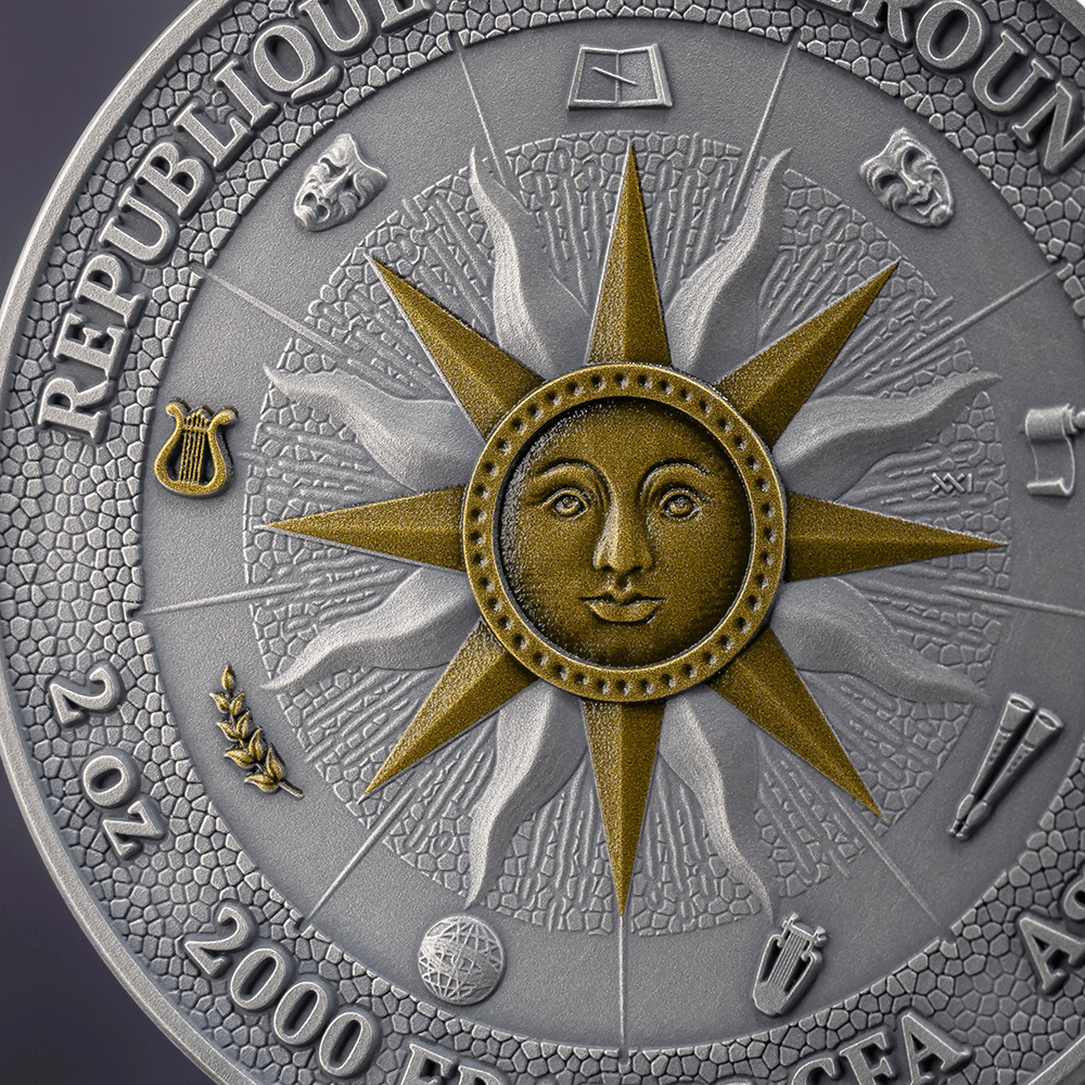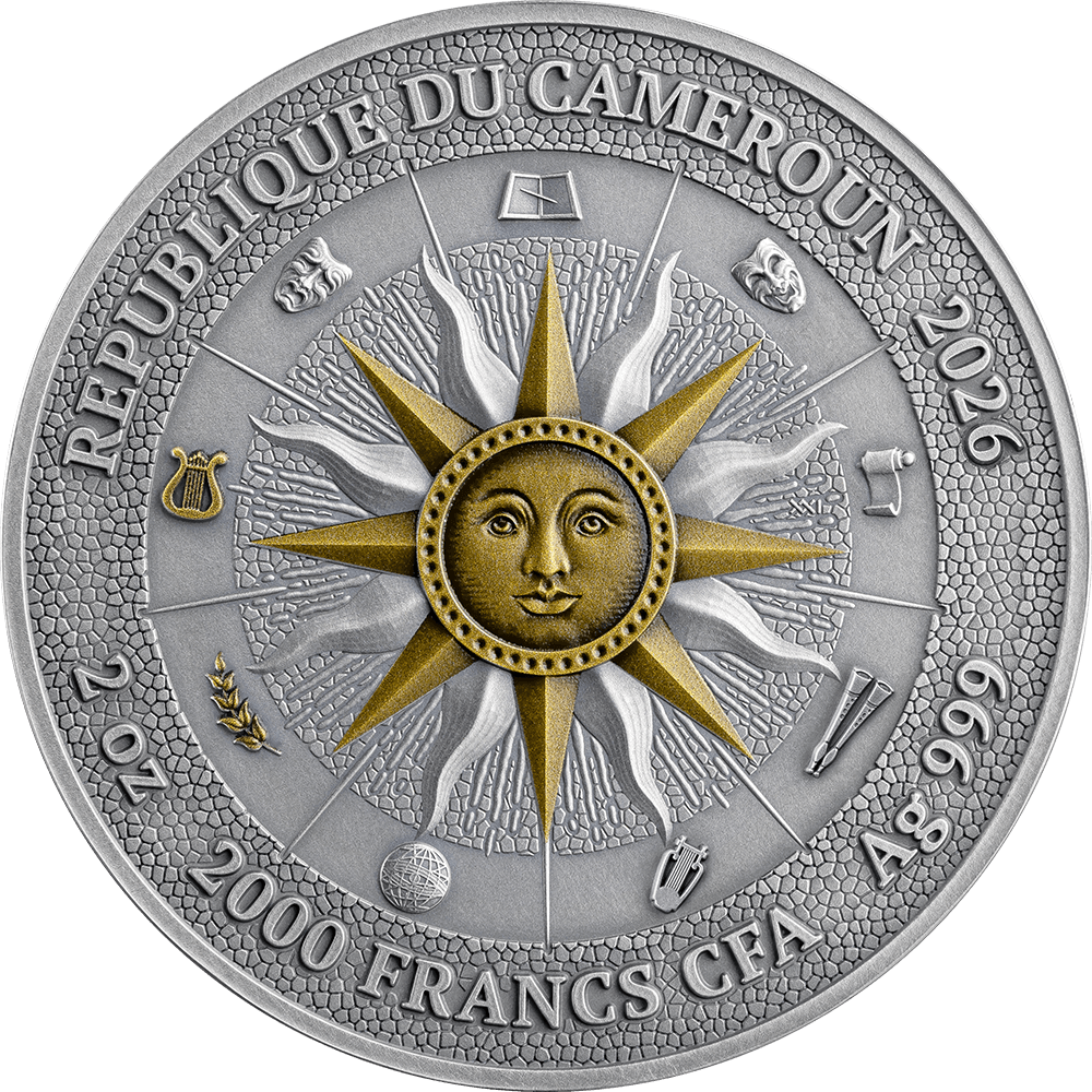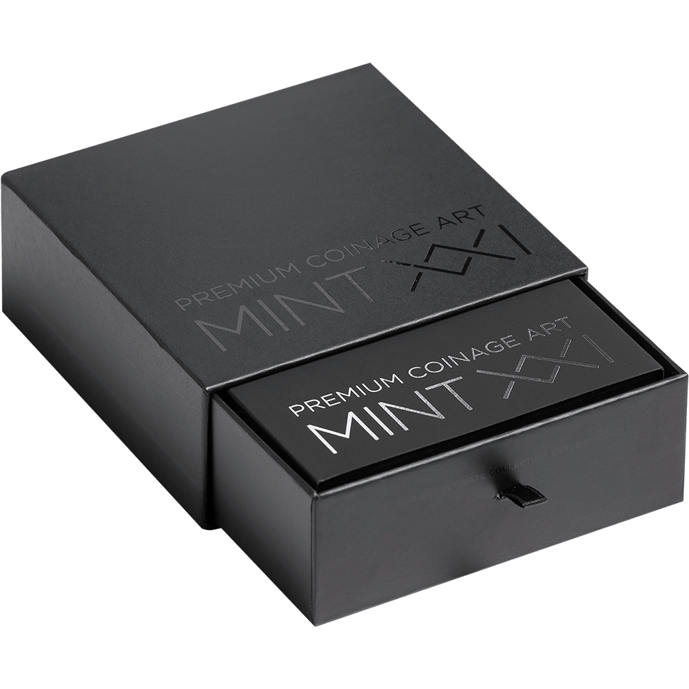 This 2 oz silver coin renders both muses in expressive high relief, capturing the elegance of their forms and the contrast of their poetic realms. Digital printing recreates the signature ancient mosaic effect, while digital gilding adds luminous accents to the composition — enriching the scene with classical grandeur and radiant depth. The final issue of The Nine Muses collection, this coin brings the series to its poetic completion. A crowning piece for collectors fortunate enough to unite all the voices of the Nine Muses — Calliope, Clio, Euterpe, Thalia, Melpomene, Terpsichore, Erato, Polyhymnia, and Urania — masterfully brought to life by MINT XXI.