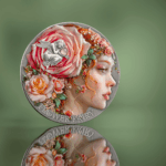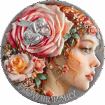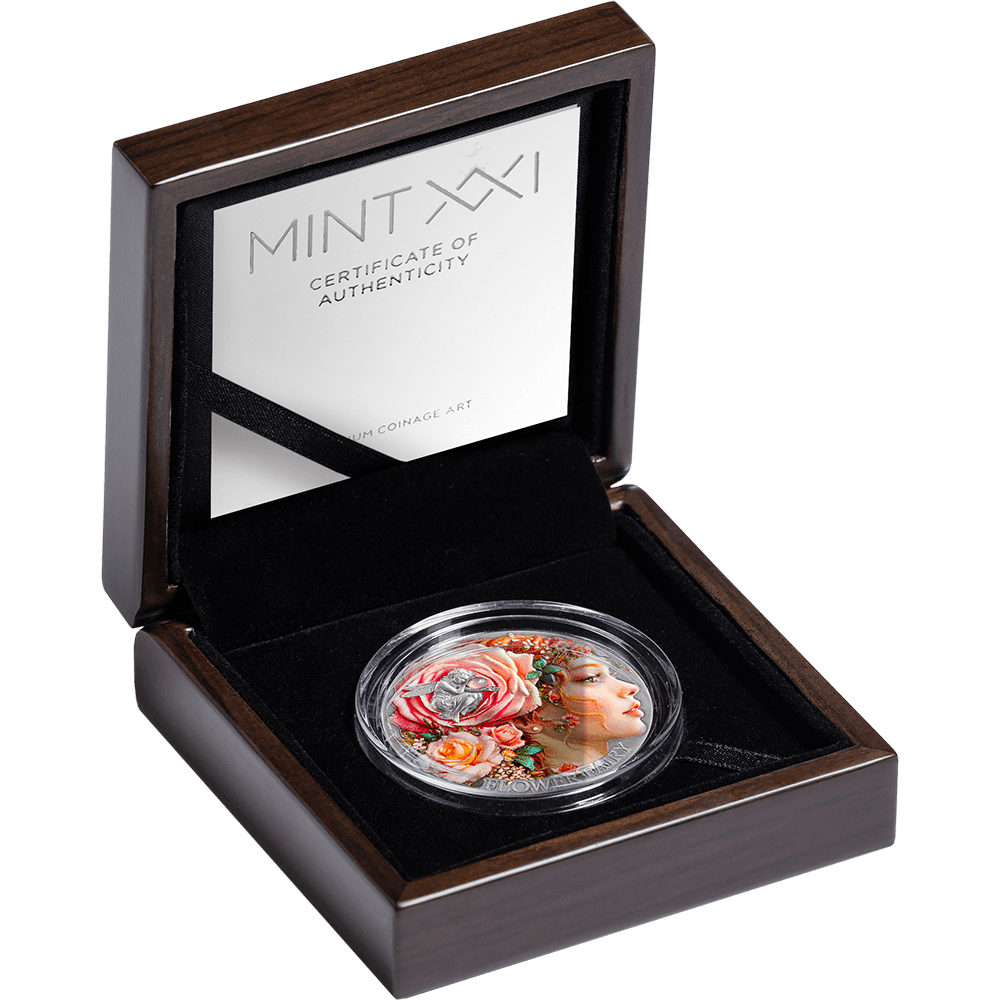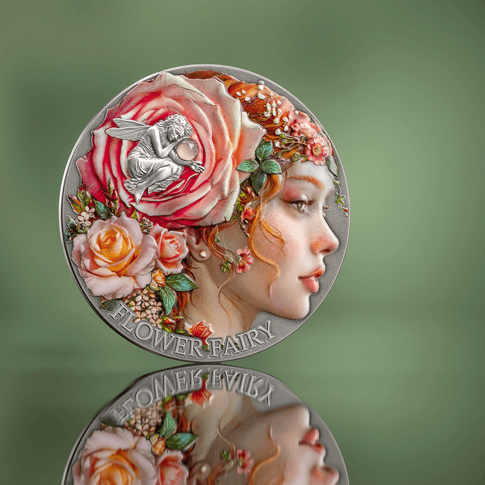 Her profile emerges in exquisite high relief on 2 oz of .999 fine silver, crowned with roses and surrounded by a cascading bouquet in full blossom. A tiny winged figure nestles among the petals, whispering of the hidden magic within every garden. Vivid digital printing brings the scene to life with soft, painterly color, while a radiant rose agate insert adds a shimmering accent to the composition.