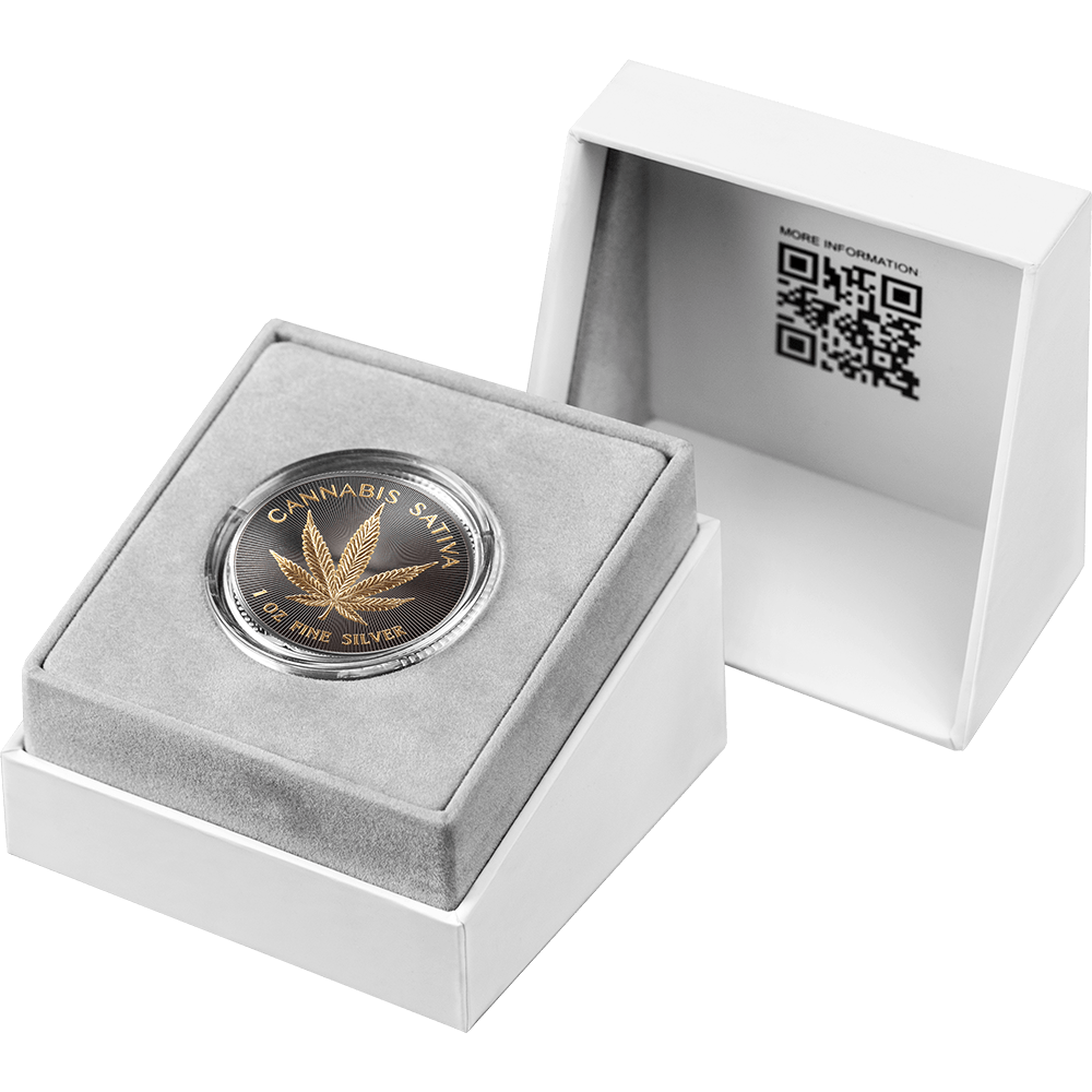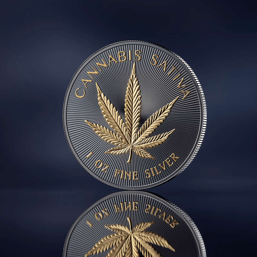 The Cannabis Sativa leaf takes center stage on the reverse, interpreted in the finest traditions of classical numismatics. Struck in radiant gilding against a deep ruthenium-plated silver surface. The contrast is deliberate — a sharp interplay of light and darkness, transforming a familiar form into a striking visual code. Hemp distills this essence into a contemporary object — defined by craftsmanship, contrast, and clarity of form.