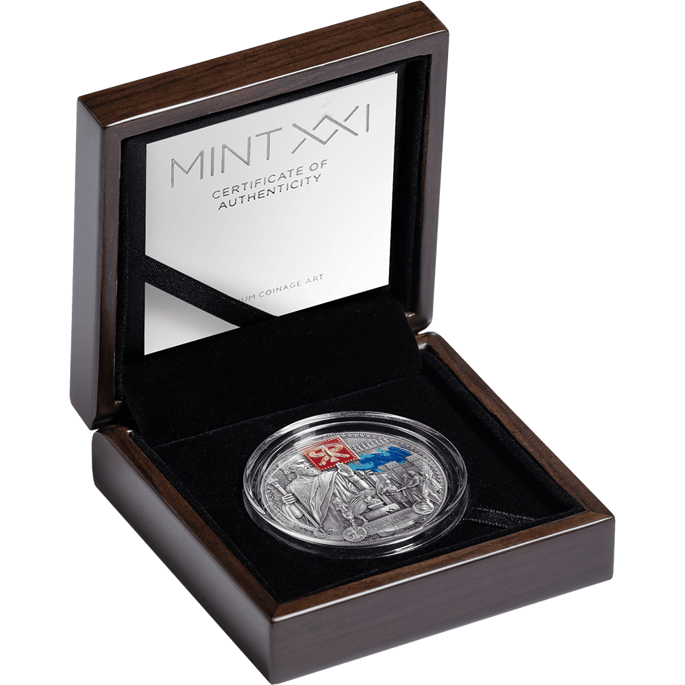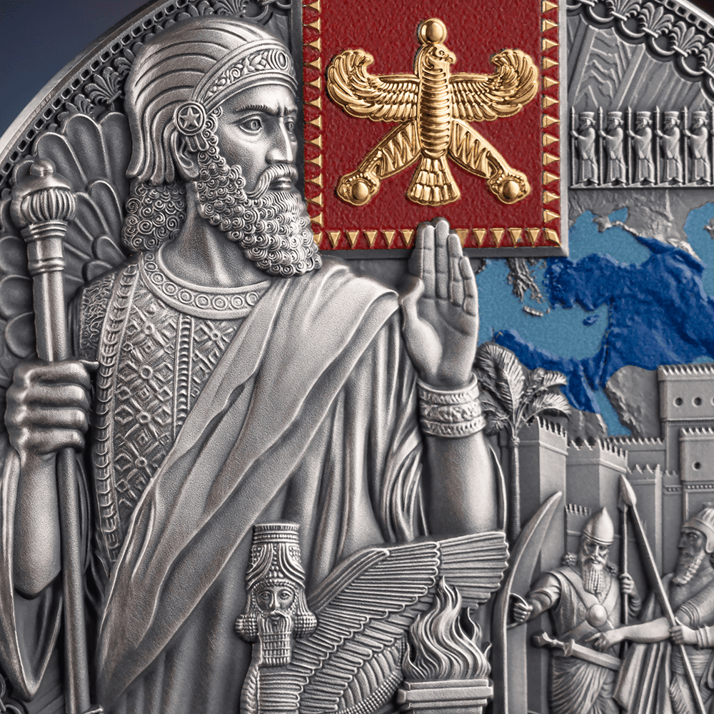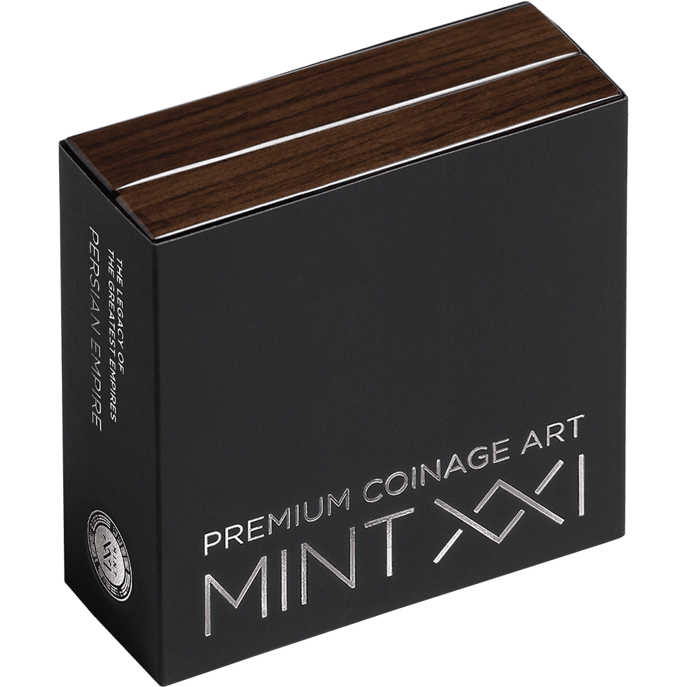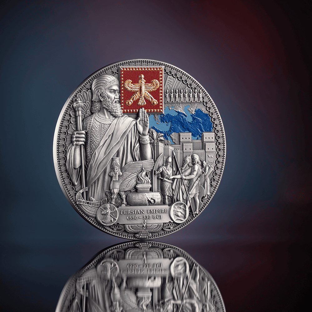This 2-ounce silver coin presents a Persian sovereign in commanding high relief, flanked by the legendary Immortals — the empire's elite guard. The composition weaves together defining symbols of Persian greatness: the Cyrus Cylinder, regarded as the world's first declaration of human rights, a sacred Zoroastrian fire altar, the winged lion, and the gates of Babylon. Digital printing traces the vast reach of Persian dominion across the ancient map, while gilding illuminates the empire's iconic crest.